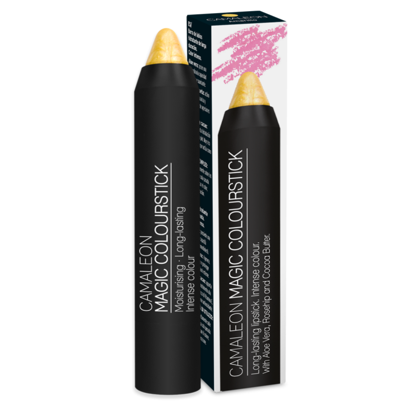 El Camaleón Magic Colourstick es un pintalabios permanente con 12 horas de duración demostrada. Su fórmula es hidratante, de color intenso y resistente al agua. Este labial nutre, regenera y protege los labios, al tiempo que realza la tonalidad natural sin cuartearse. Gracias a sus activos naturales, consigue hidratar, nutrir, remineralizar, suavizar y regenerar los labios, dejándolos cuidados y sensuales. Su composición permite que el color sea totalmente personalizado, ya que los pigmentos especiales reaccionan a la humedad de la piel y el aire, desarrollando un color único con más de 12 horas de duración. Hay seis colores para elegir: gris, amarillo, verde, rojo, coral y melocotón.
